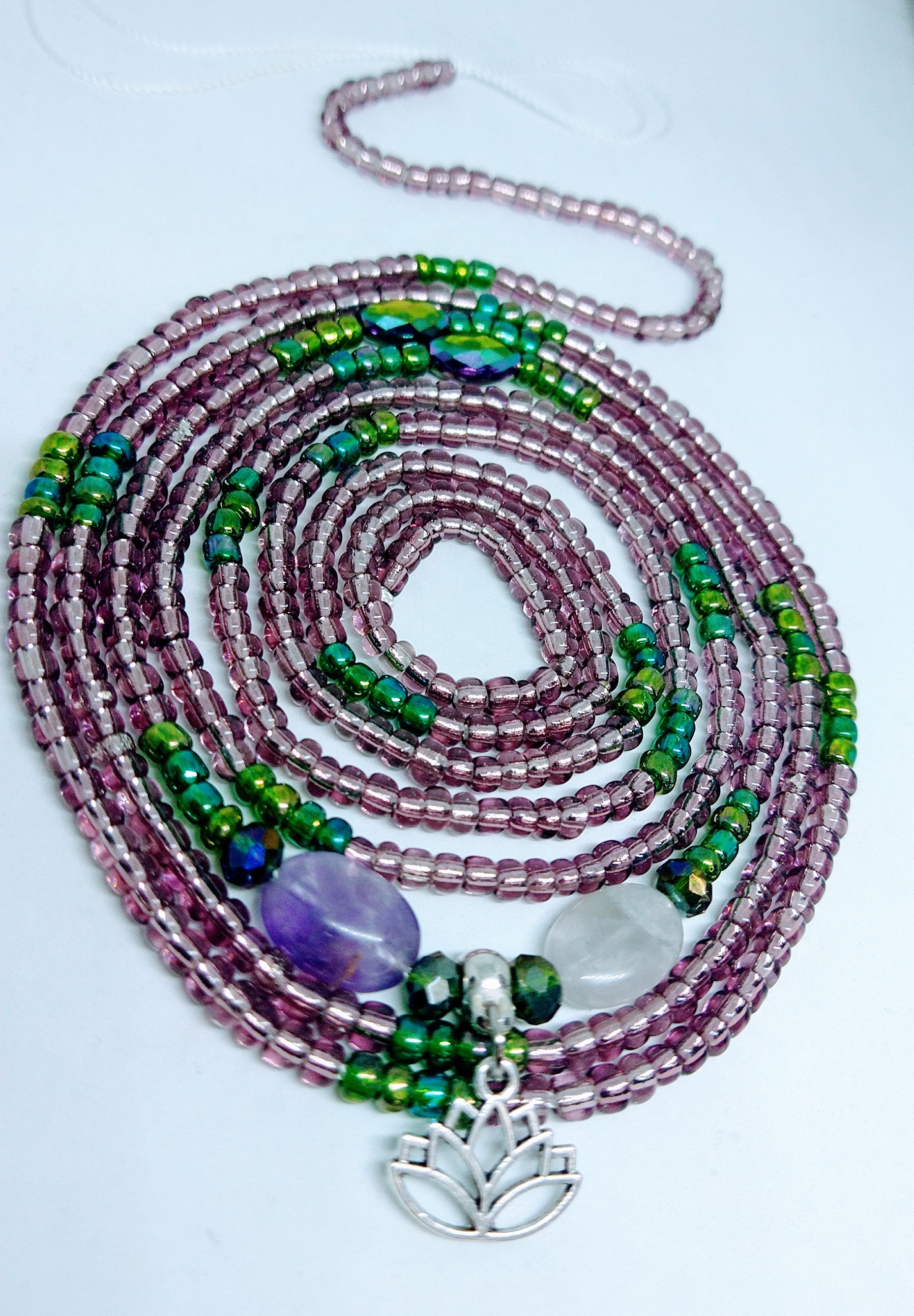 Amethyst and green beads, energetically charged with Amethyst oval stones and accented with Lotus flower charm make this beauty perfect for encouraging calmness , and relaxation.