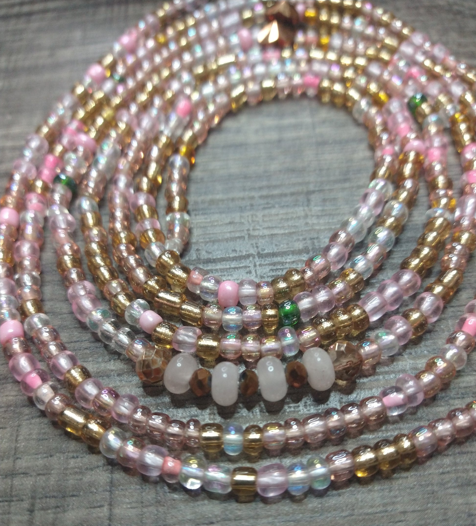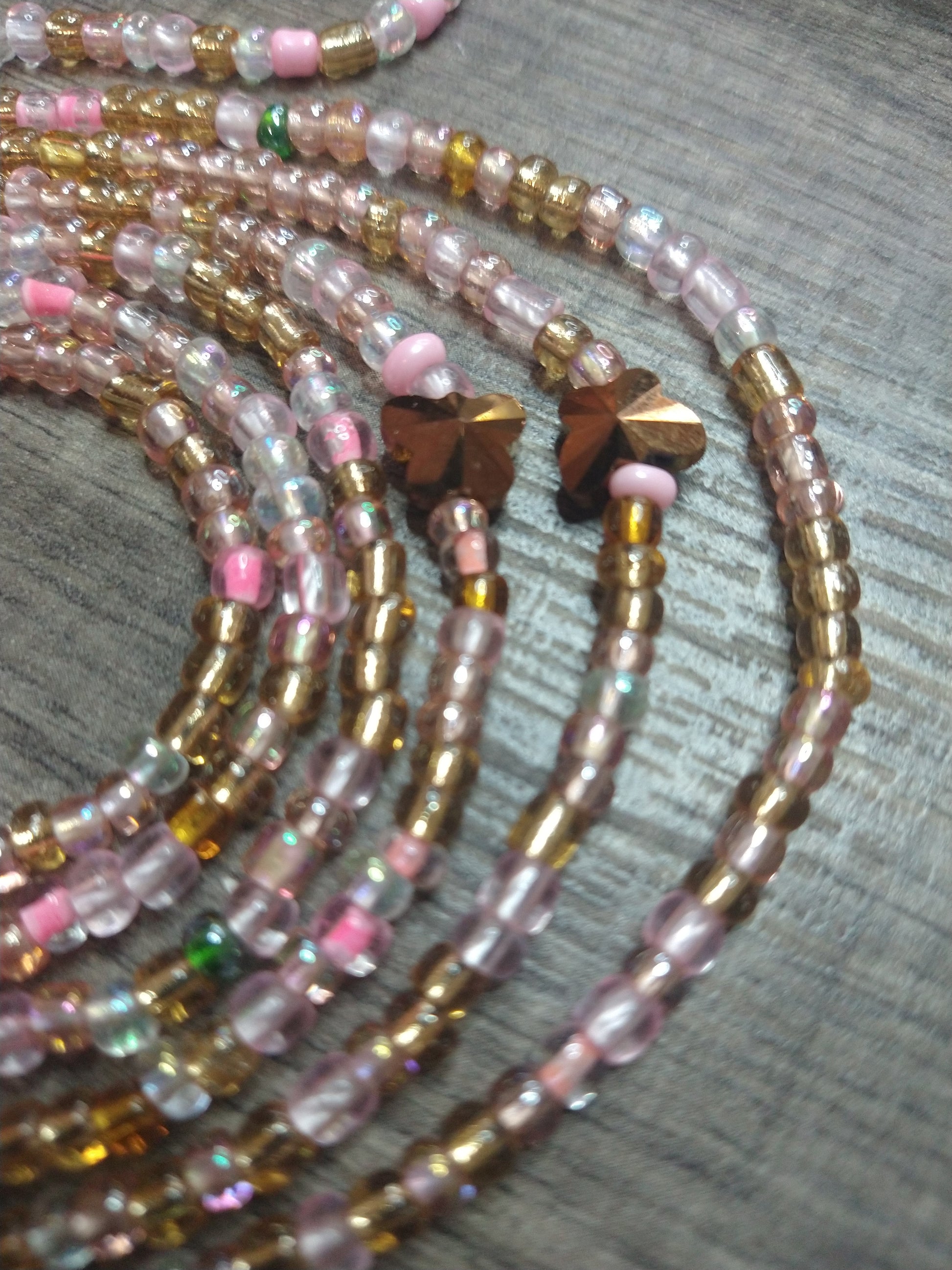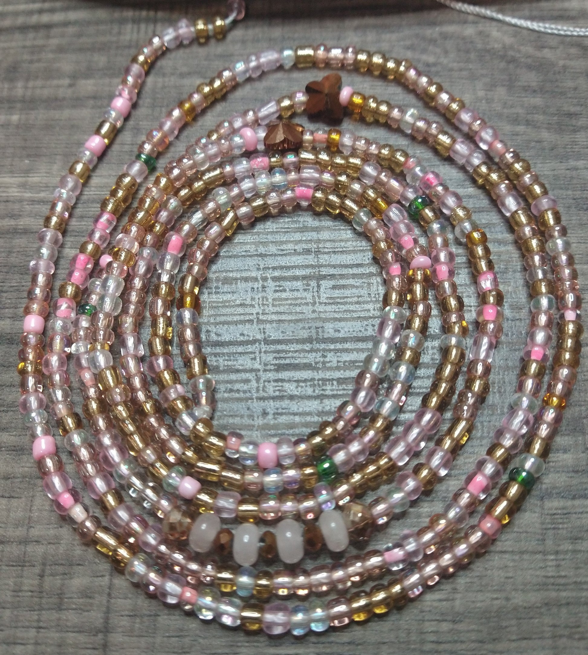 This beautiful strand in shades of pinks and rose gold accented with copper colored crystal butterflies and energetically charged with rose gold stones.