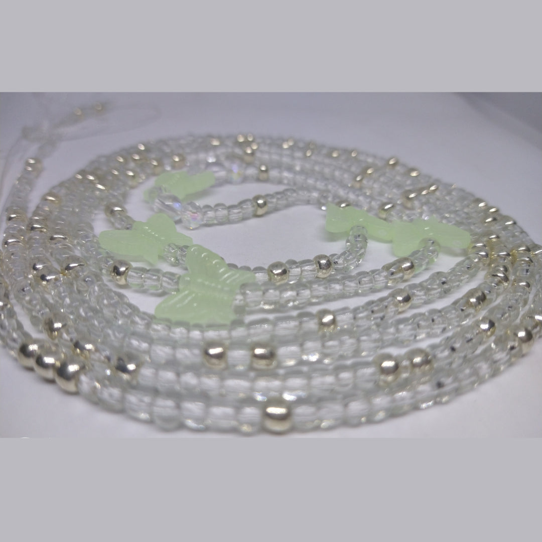 Butterflies represent transformation, change and hope. Seeing butterflies is a joyous and hopeful sign. Butterfly Glow waistbead is made with clear quartz stones, clear and silver beads and glow in the dark butterflies that are charged when exposed to light and illuminated in the dark.
