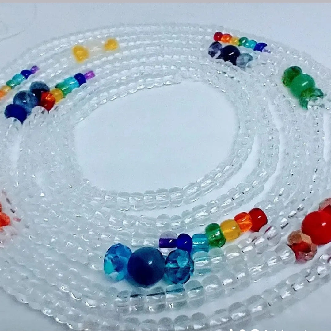 This crystal clear waistbead can be worn to help remind you to stay in alignment and to focus on keeping the 7 chakras balanced. This strand is accented with seven colors associated with each chakra and 7 stones that help to recharge and balance each chakra.