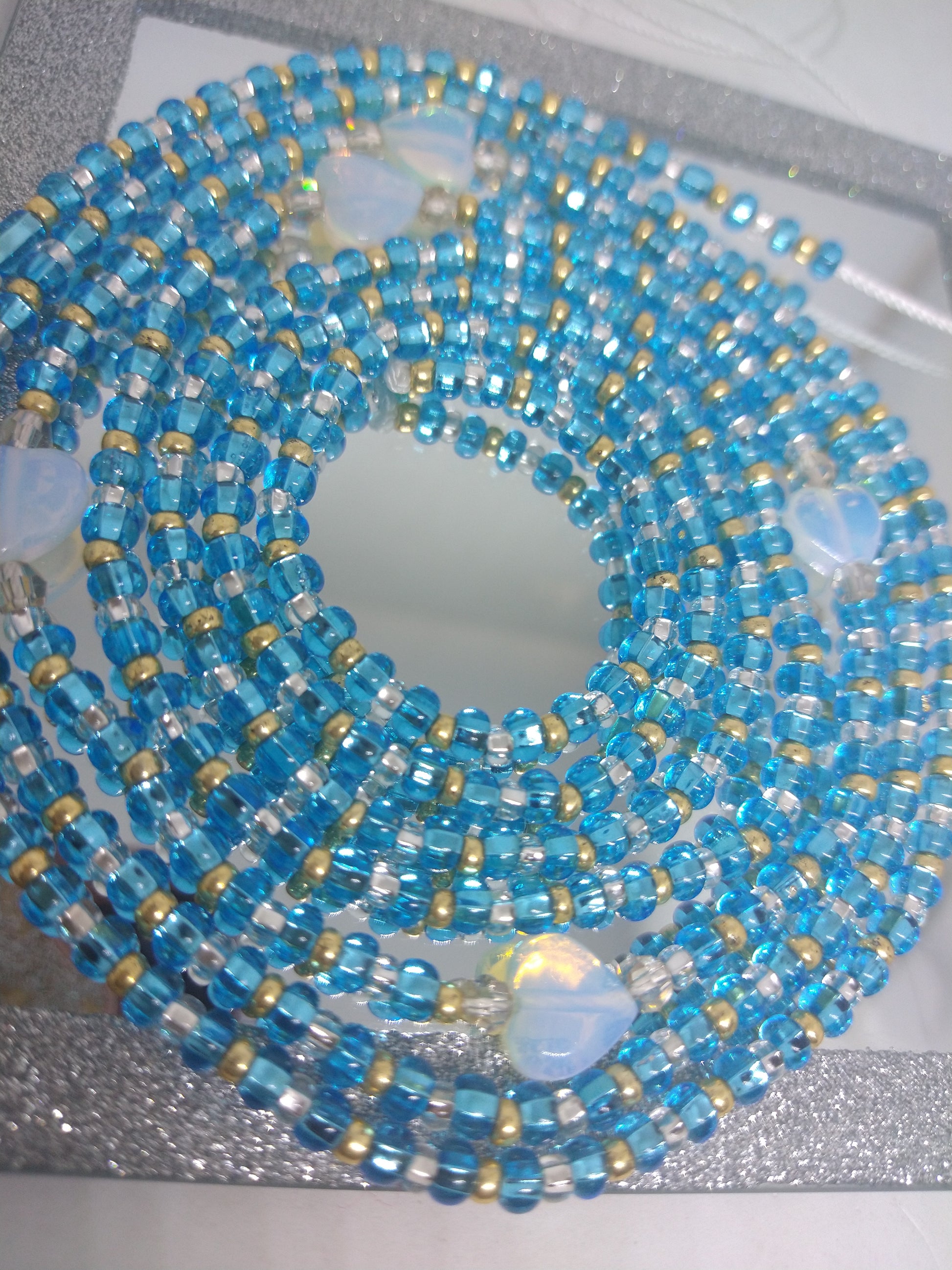 Adorn your waist with elegance and intention. Hand-stitched with shimmering Czech beads in turquoise and gold, this strand features glowing opalite heart stones that bring balance, clarity, and radiant energy. Perfect for sacred adornment or everyday wear, these waistbeads are made to highlight your beauty and attract positive vibes.
