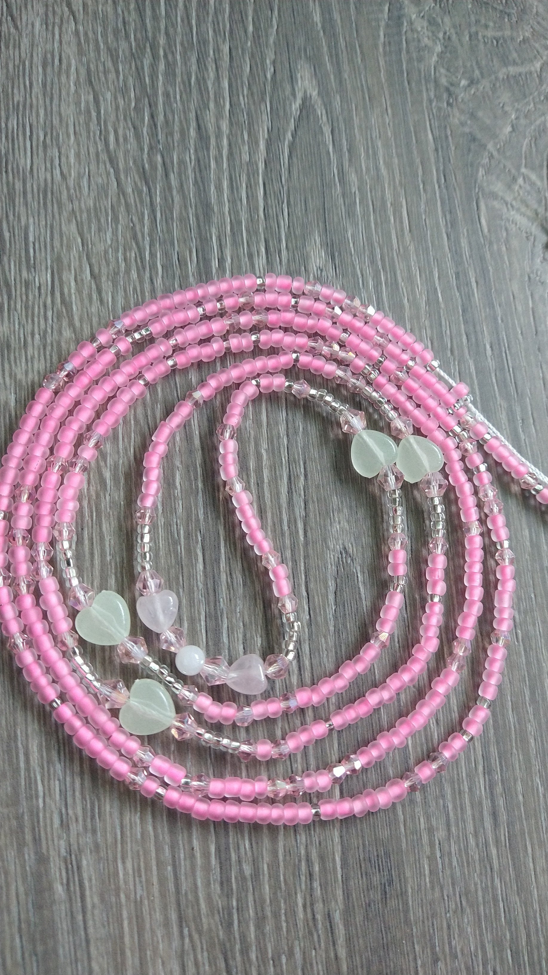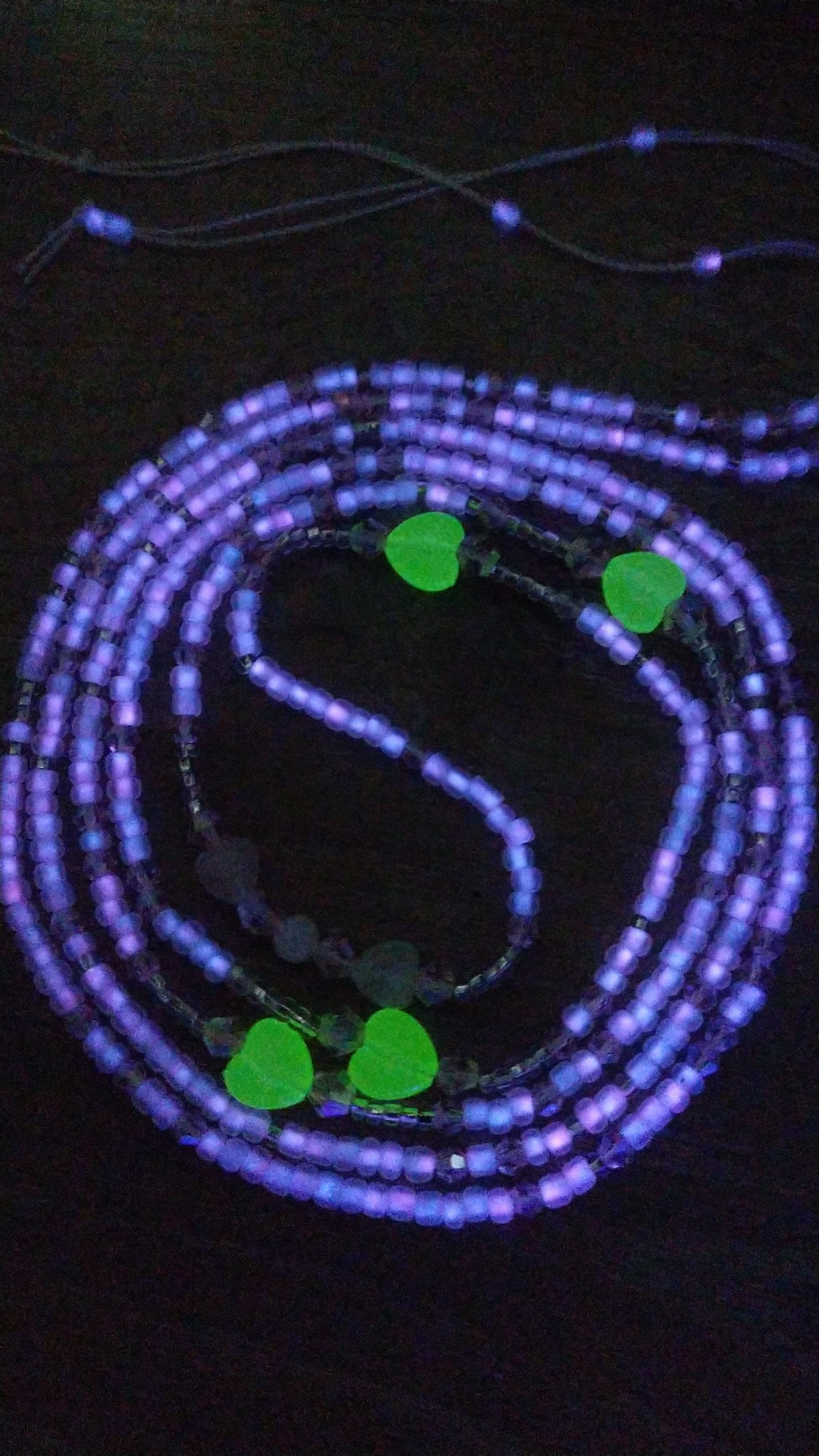 Turn every glance into a lingering gaze with Hearts Aglow. Strung with soft pink glow in dark beads, rose quartz heart stones, and glow-in-the-dark hearts, this waist adornment shifts from sweet to seductive as day turns to night.