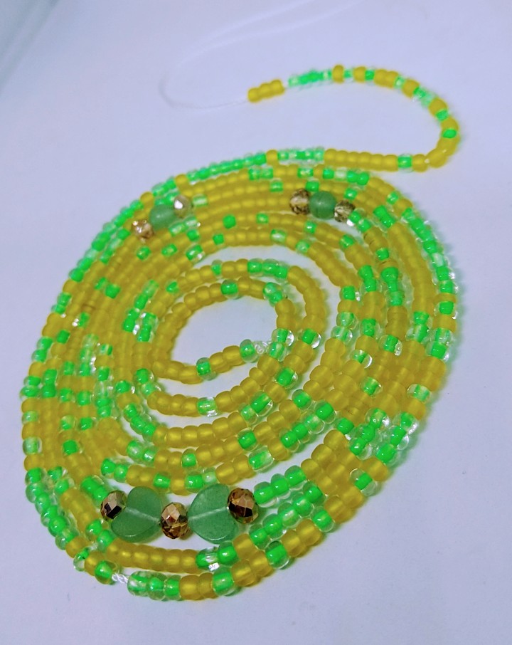 Neon Green and Mat yellow beads energetically charged with adventurine Heart stones. Fun summer color to keep your heart chakra aligned and keeping prosperity near.