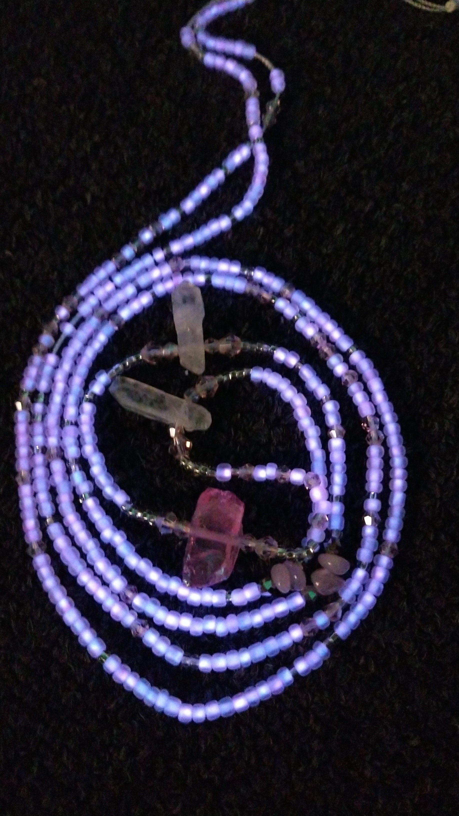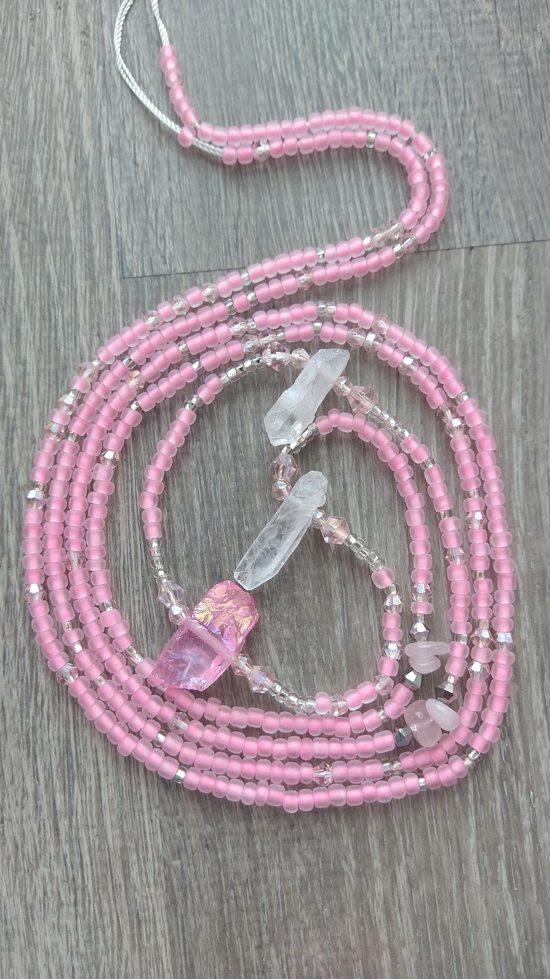 Step into your divine feminine power with Lunar Quartz Glow. Handcrafted with soft pink glow-in-the-dark beads, radiant rose quartz chips, shimmering clear quartz points, and rare pink titanium quartz, this piece channels both love and mystical energy.