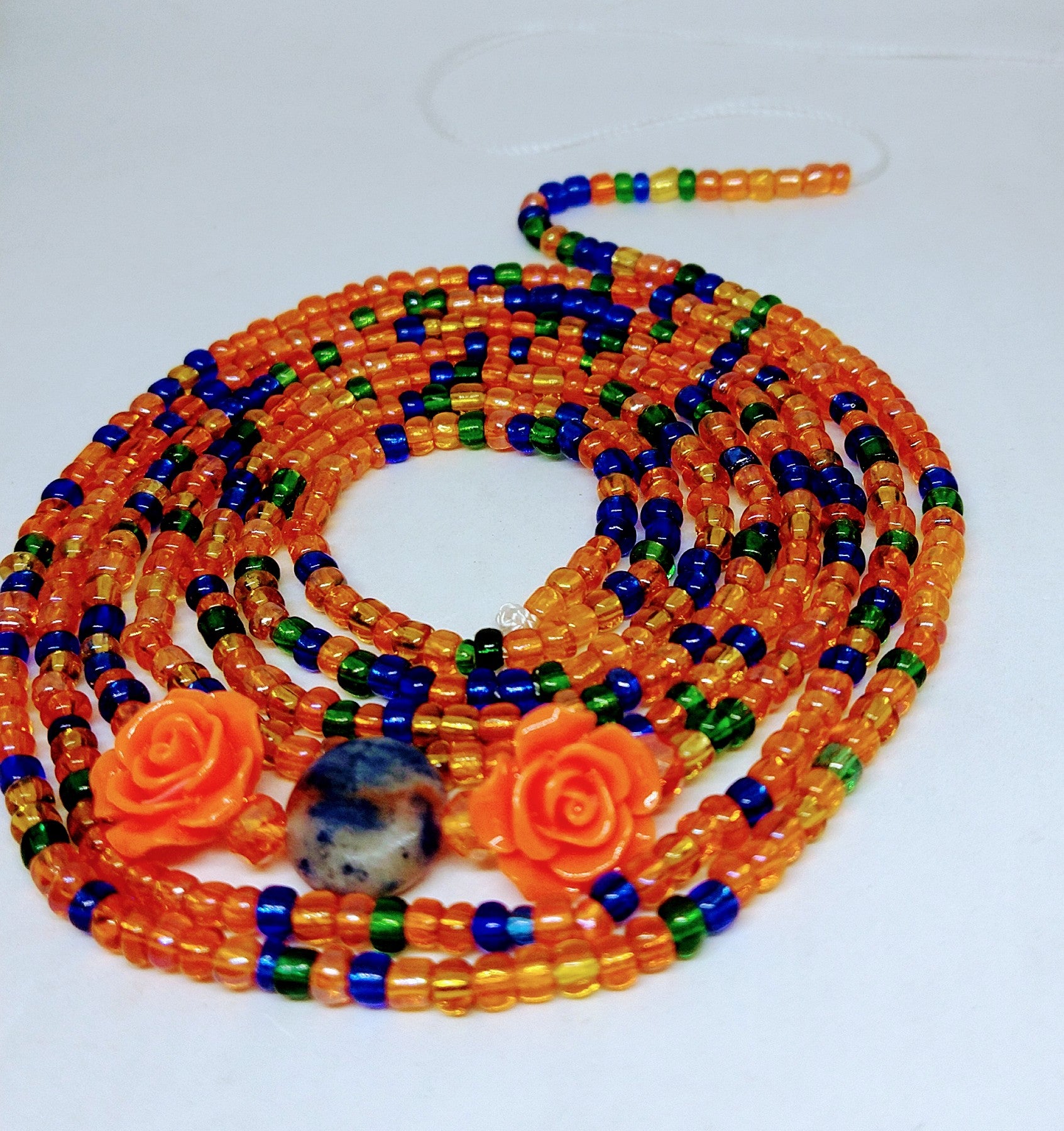 This orange, blue, green and yellow strand energetically charged with sodalite round stone and accented with orange flowers screams creativity and rebirth, perfect for awakening your sacral and throat chakras.