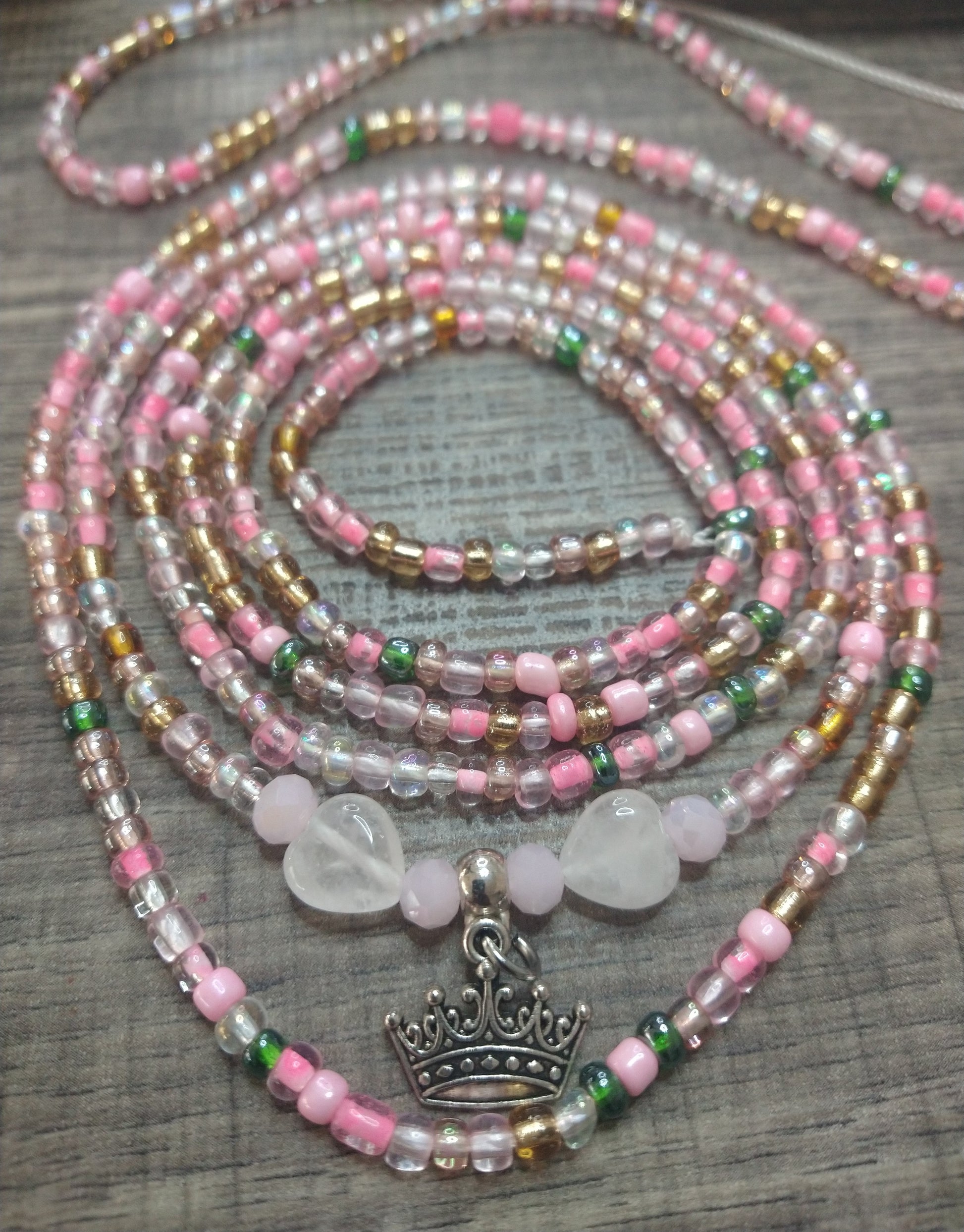 Beautiful Waistbead strand in shades of pinks and rose gold beads. Energetically charged with clear quartz hearts and embellished with a Crown hanging charm.