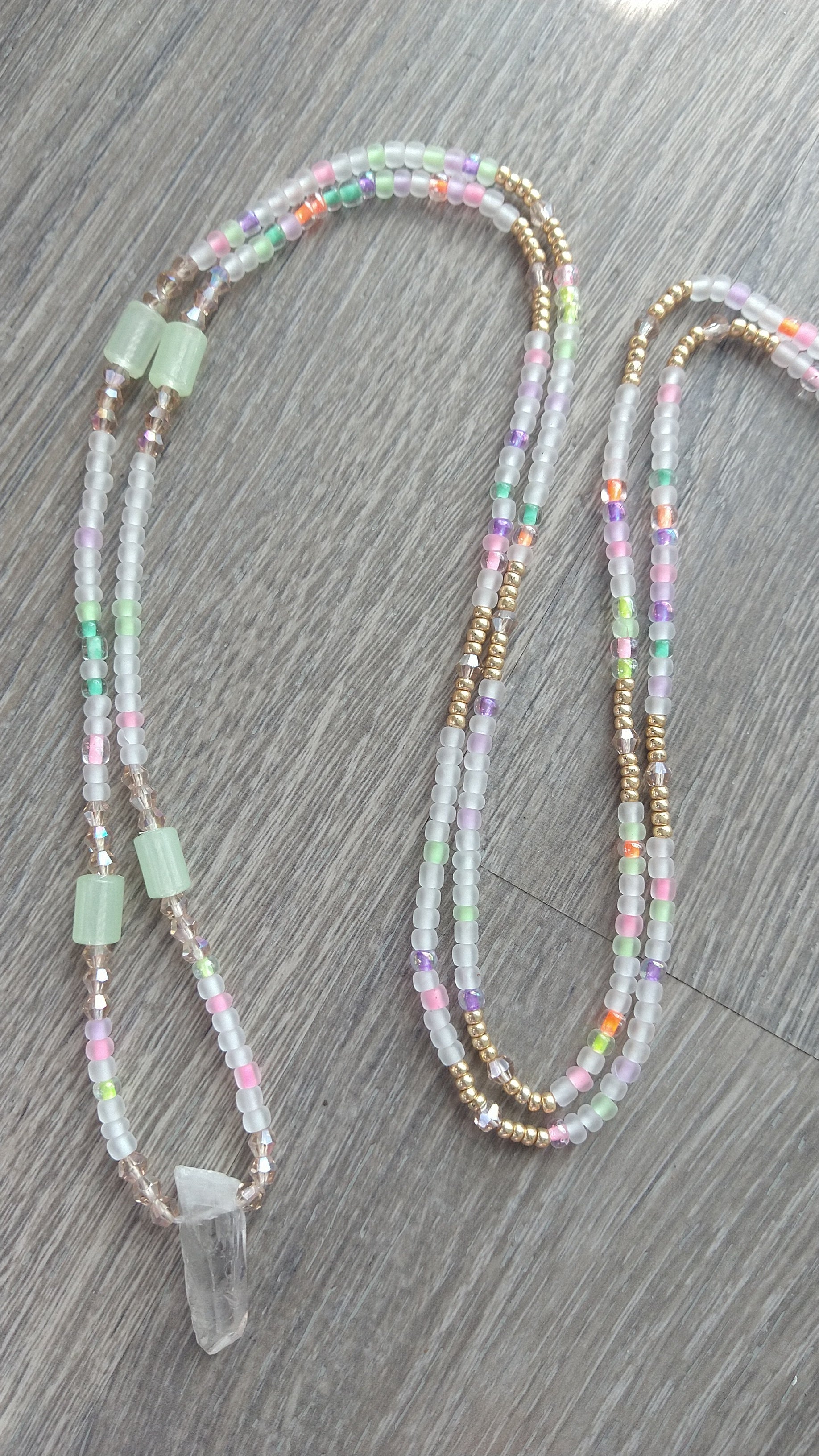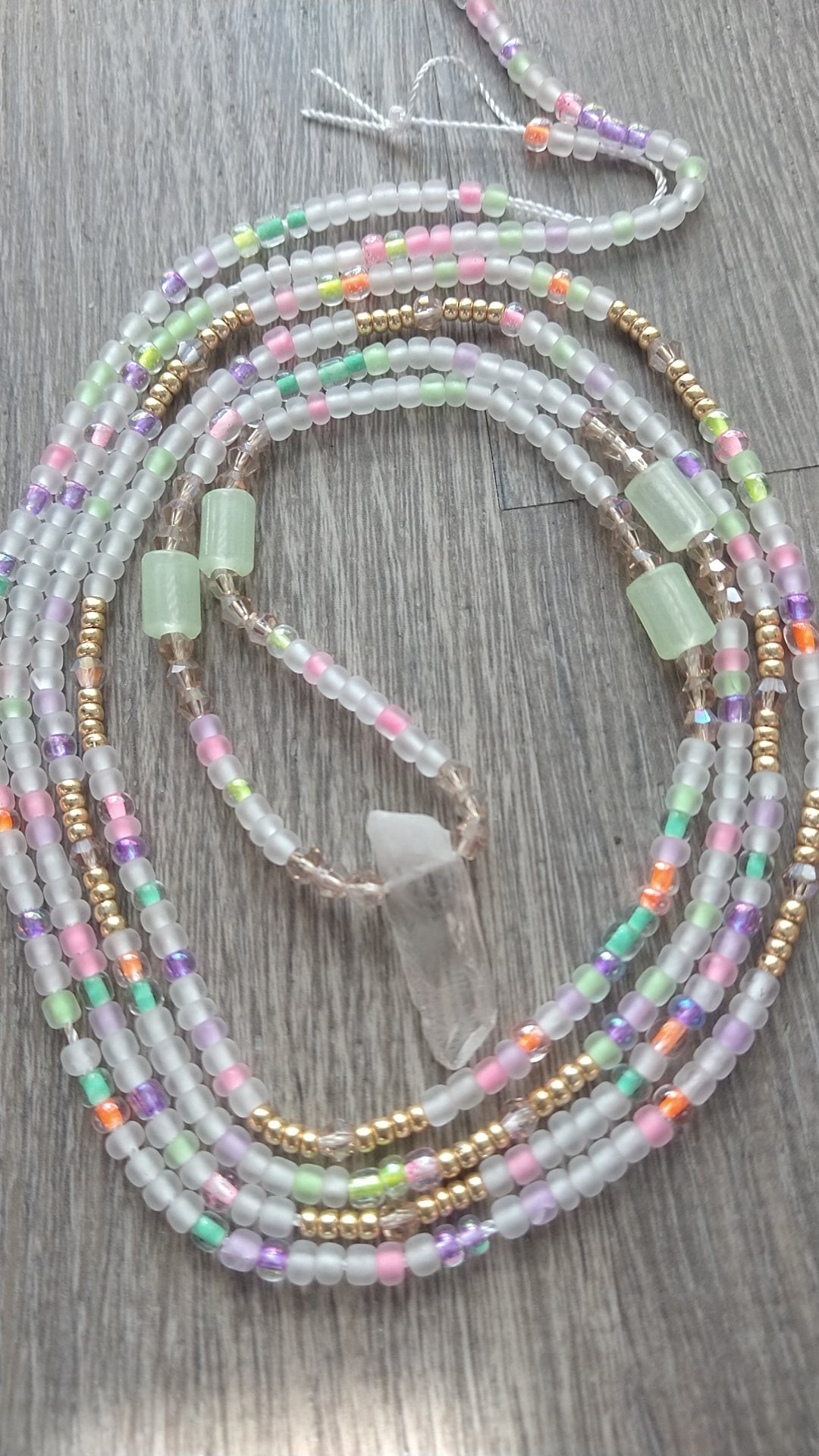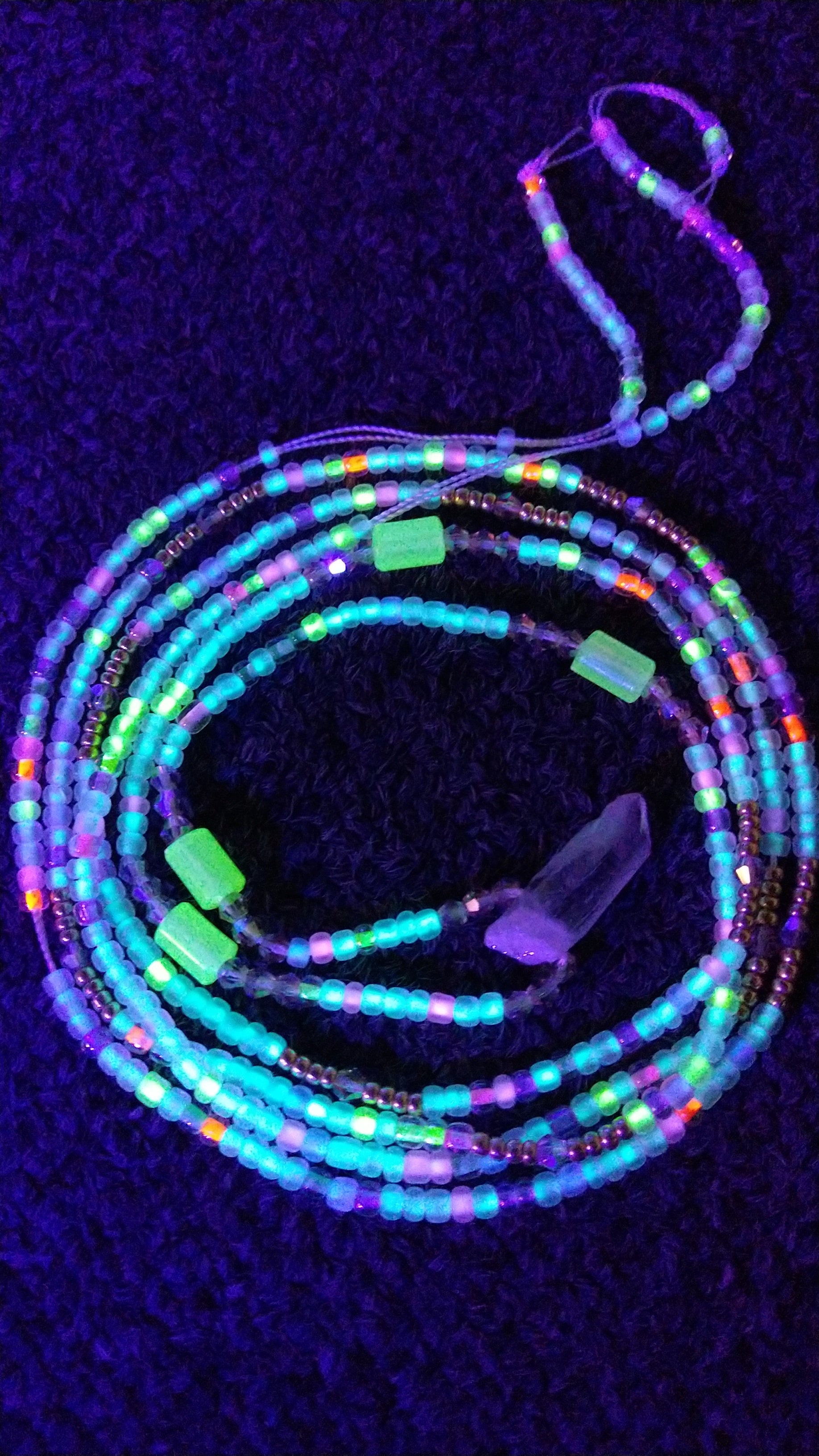 Shine like the night sky with our Starlight Quartz Waistbeads. Designed with glowing white beads that light up in the dark, flecked with hints of neon for a cosmic sparkle, and finished with elegant gold accents. At the center, a Clear Quartz point radiates healing energy, amplifies intentions, and protects your spirit.