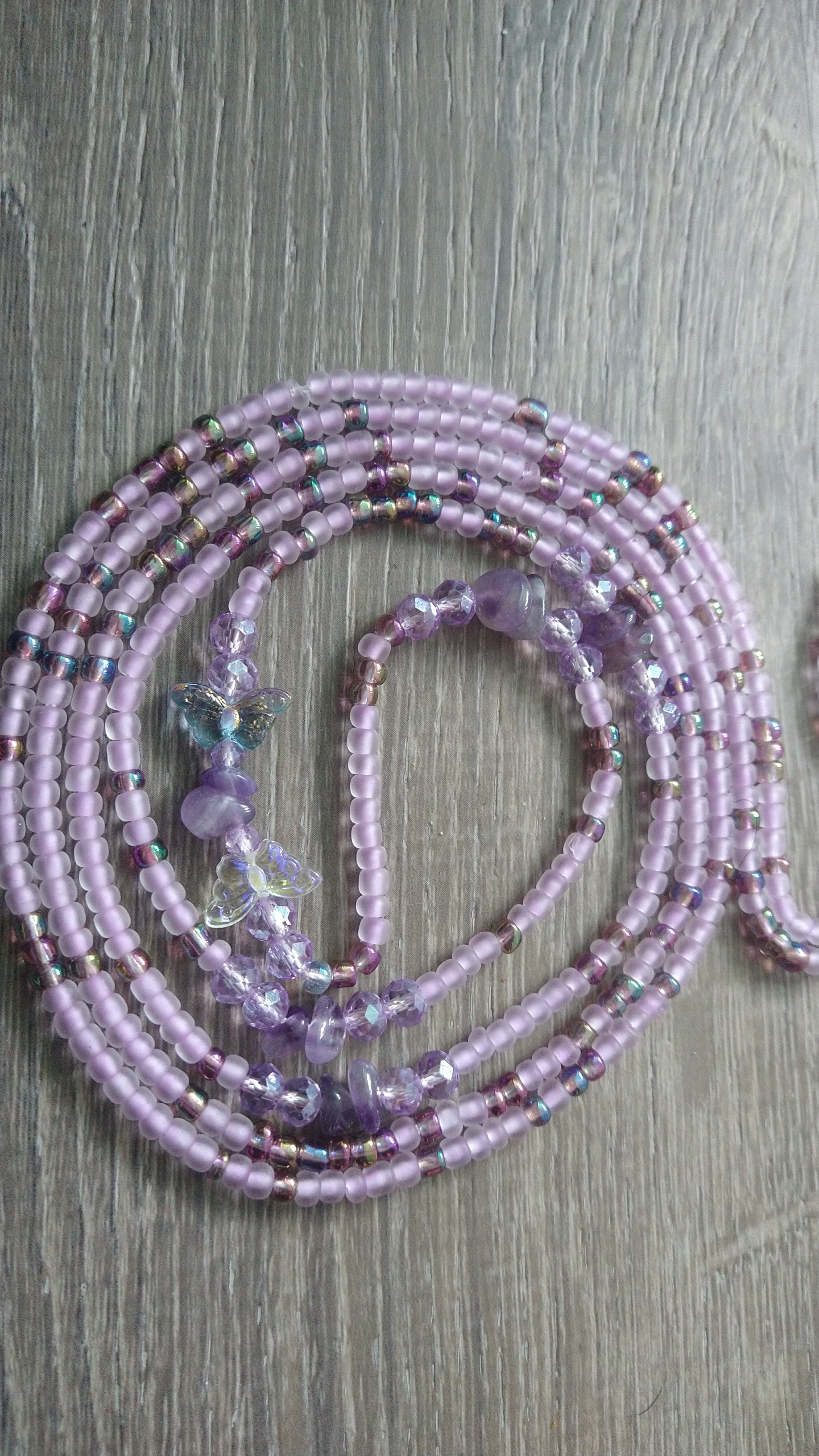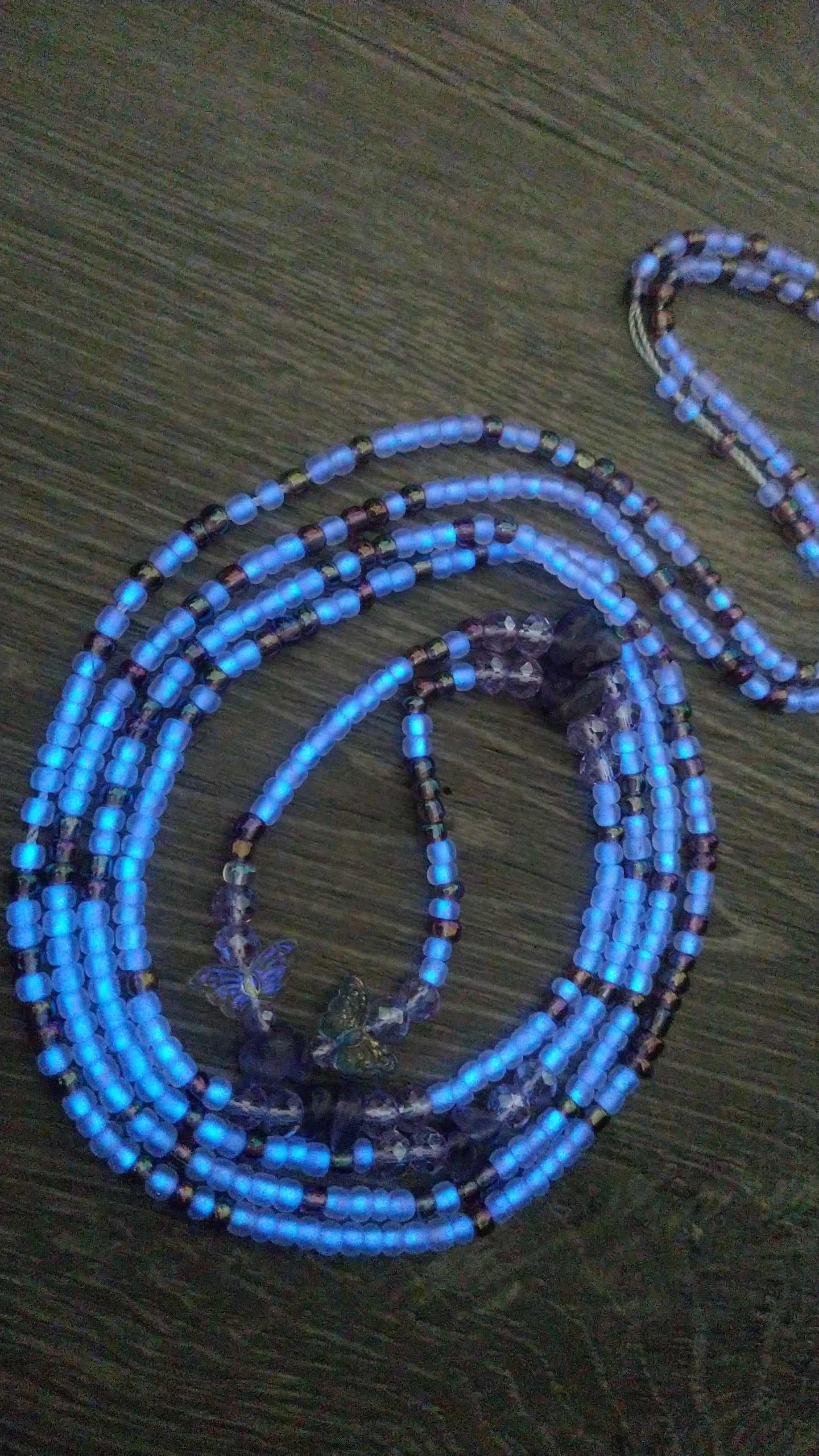 Purple glow-in-the-dark waistbeads with crystal wing charms and amethyst chips for protection, transformation, and radiant goddess energy day or night.