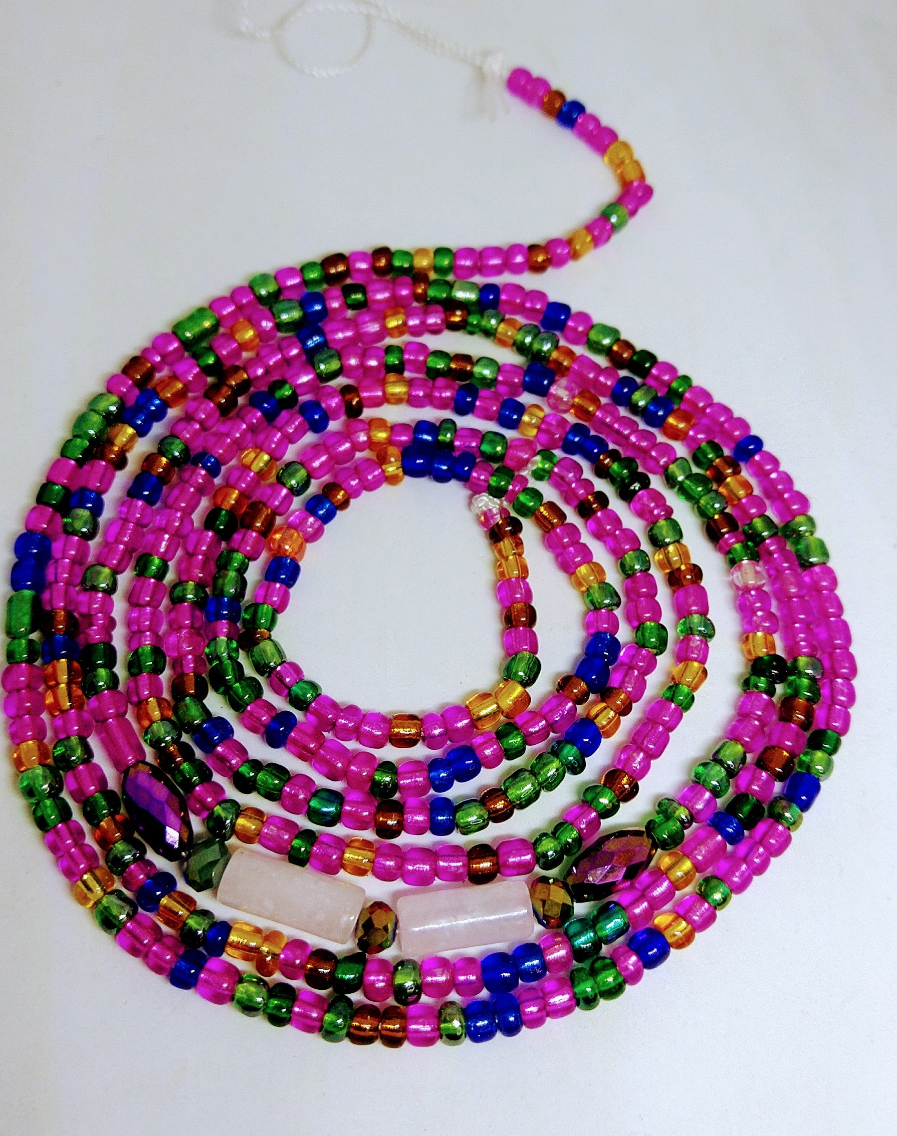 Fun mix of purple, green, yellow, blue and copper beads energetically charged with rose quartz cylinder stones. This strand supports love and spiritual connections.