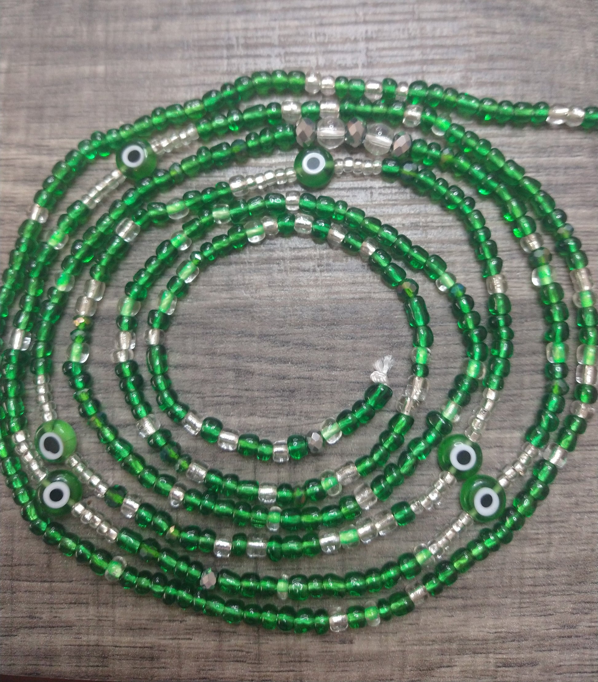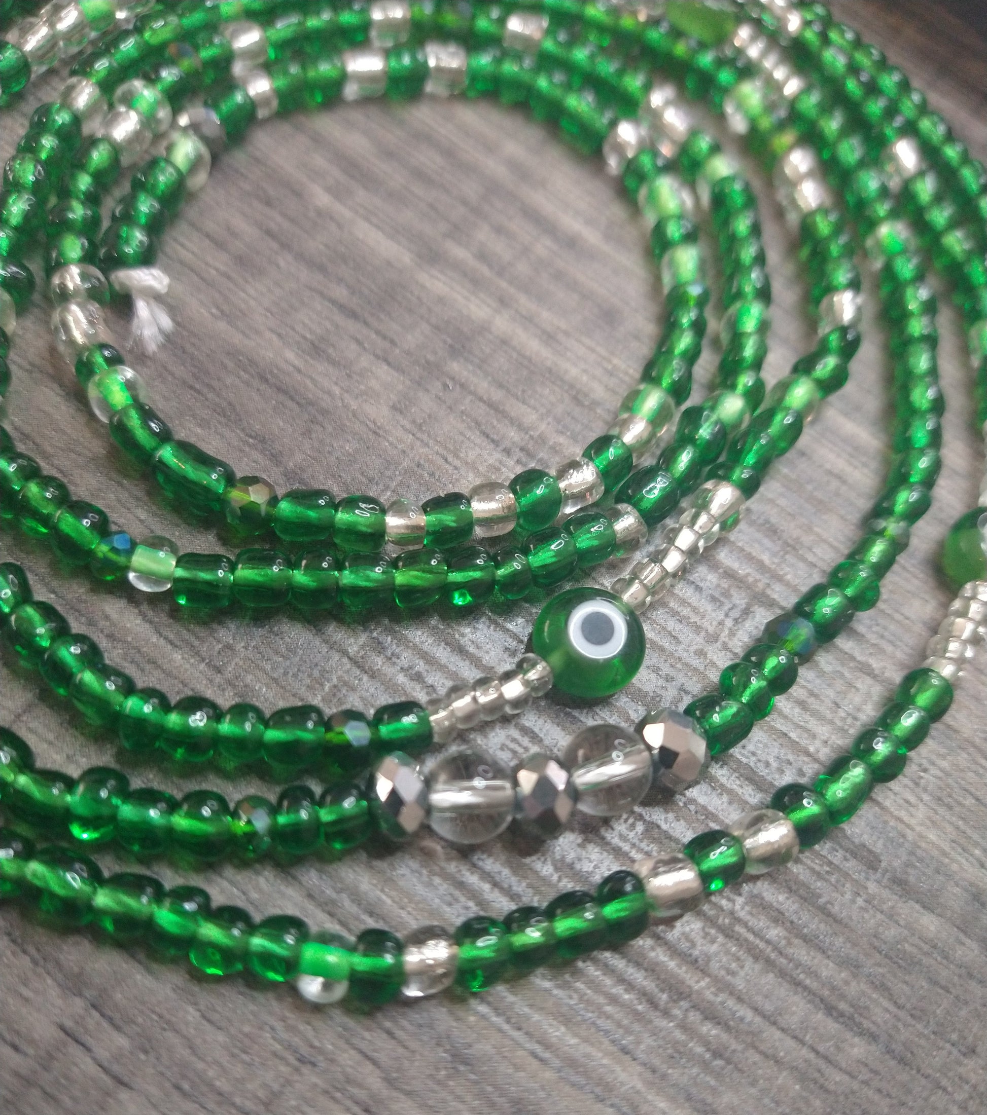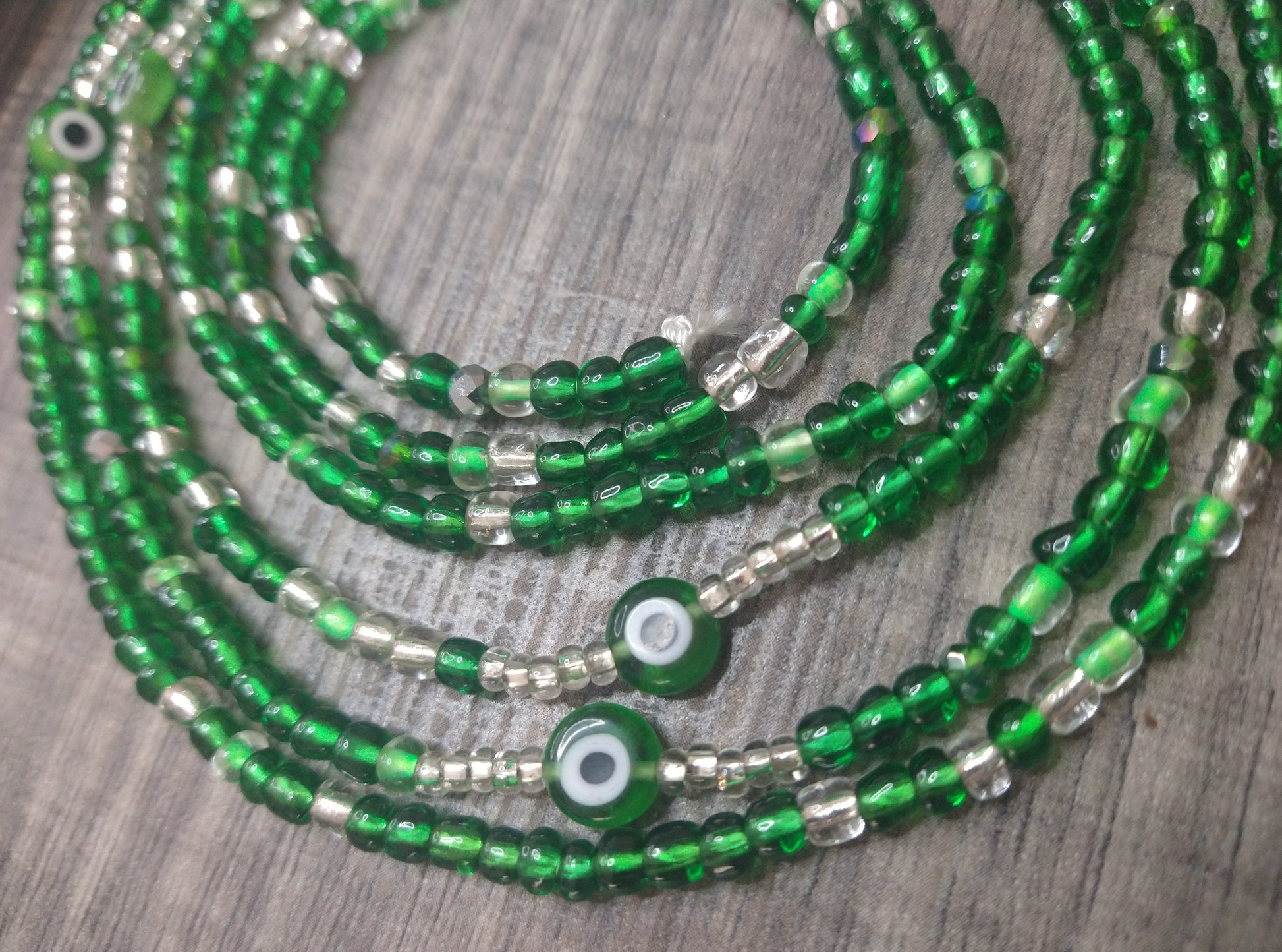 Emerald green colored evil eye waistbead embellished with evil eyes talisman beads and energetically charged with clear quartz stones